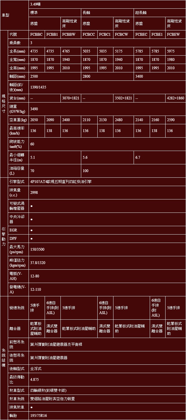 Mitsubishi Fuso Pro Canter基本規格表 (3.49噸):