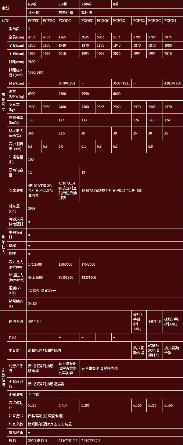 Mitsubishi Fuso Pro Canter基本規格表 (6.9噸至8噸):