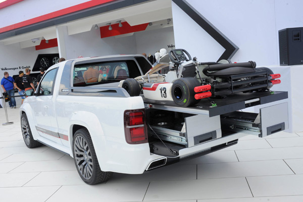 Amarok車尾的貨床可提供約3.5平方英尺的置物面積,然而這輛Amarok的車尾則設計為承載Go-Kart卡丁車的平台,平台下還設置兩具抽屜式的工具櫃,讓這輛Amarok概念車有如移動式的Go-Kart工作站。