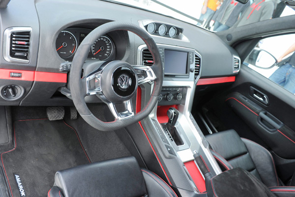 採用仿碳纖維紋理皮革、與麂皮包覆為主的內裝設計,更以部份的紅色縫線與飾板點綴,來強化Amarok概念車的性能取向。