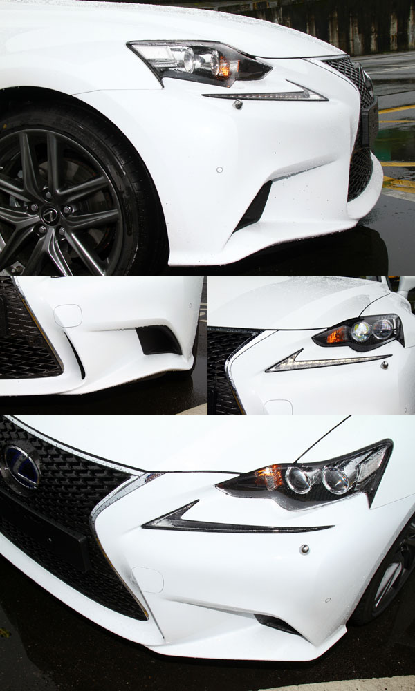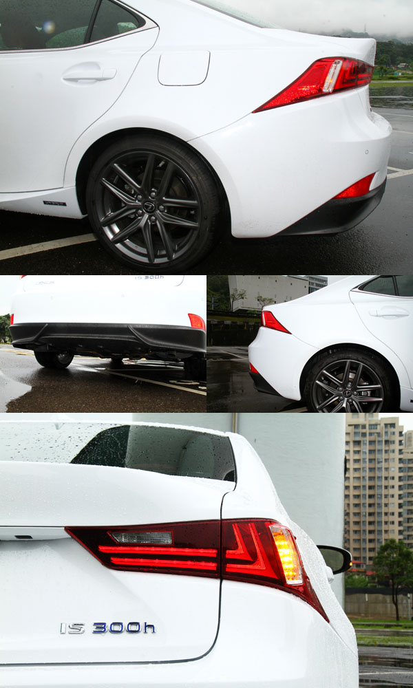 而當本次試駕IS300h F SPORT,實際親眼見到它樣貌,看久了卻總有種說不上來的不協調感,怎麼看都像是多了什麼;首先在車頭部分,全新IS車系同樣採用了Lexus全新家族共通表徵Spindle Grille紡錘式大型水箱罩,相較於其他車系,同樣的設計運用於IS車系上,在整體車頭面積的比例被放大不少,也讓IS車系多了分狠勁,不過,其他車系都是簡單地搭配上傳統地鷹眼式頭燈等元素,IS卻使用了多邊型頭燈,同時在頭燈與前保桿間還加入了一道〝勾勾〞型的LED日行燈,加上本次試駕的IS300h F SPORT,配置了運動化套件,下保桿同樣多加了幾個進氣口與幾道曲線,瞬時間反而讓整個車頭的設計變得有些繁瑣;接著將視線移往車側,過去,Lexus向來鮮少在車側鈑件線條上多做文章,全新的IS仍大致維持相同的風格,然而就在平順的設計中,至後葉子板與尾燈、後保桿間的連接處,卻為了與側裙造型相連結,將尾燈前緣線條與側裙後段上揚弧線連接成一氣,使得側面出現類似推土機前之推土刀的造型。