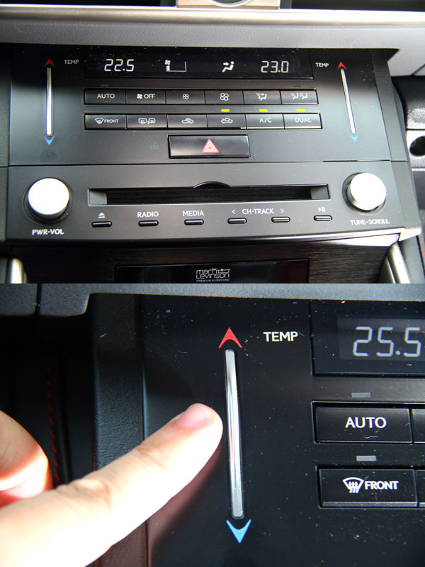 進到IS300h F SPORT座艙中,由於為F SPORT車款,採用了性能車款常用的紅/黑色為基調,控台設計大致上有GS、ES等新世代Lexus車款的影子,但在IS車系上改變了推疊的手法,在中控台上自8吋的液晶螢幕開始將不同介面逐步排列後,再將引擎啟動鈕等單一控鈕安置進去,亂中有序,相較於外觀的繁雜設計,Lexus原廠設計師反到是在主要的控制介面上予以簡化,並在空調溫度調節部分,採用全球首創的滑動式直覺溫控系統,只需要用手指觸碰觸控金屬條即可調節溫度,十分新奇,但實際使用,反而不若傳統地旋鈕或按鈕好用,因為滑動式的調溫,無法單純的用計算按按鈕的次數,或轉動旋鈕的刻度,將所需溫度一次調整到位,在觸碰過程中會因為手指滑動的速度,影響溫度改變的速度,反而無法一次到位,名為直覺,使用上卻很不容易用直覺操作。