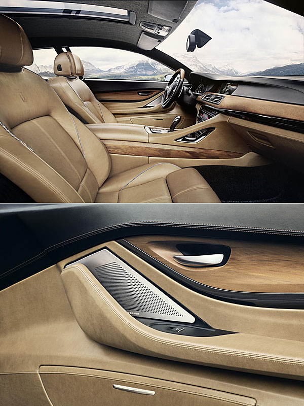 車室內的鋪陳則與當前BMW車款十分雷同,展現出BMW自豪的簡易風格,但為求對應車外的細膩氣息,導入了大量的原木材質,於中控台、方向盤、門板上都有大面積的運用,搭配上深咖啡色的真皮座椅內裝,與黑白條紋的座椅飾條,讓座艙充滿著復古情懷。