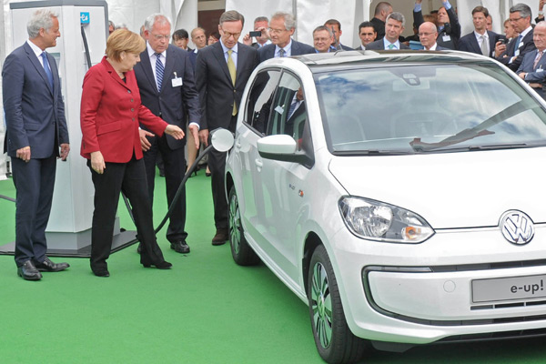 電動移動科技開發博覽會中,德國總理梅克爾也嘗試為VW e-up!電動車進行充電的動作。