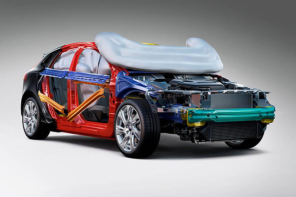 V40所搭載的行人安全氣囊系統,不僅能夠在撞擊行人時將引擎蓋抬升10公分,透過引擎蓋的形變吸收撞擊力道,同時擋風玻璃下緣的安全氣囊,還可以防止行人頭部撞擊至擋風玻璃底端或是A柱等堅硬的車身部件。