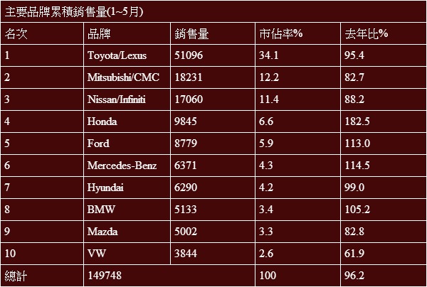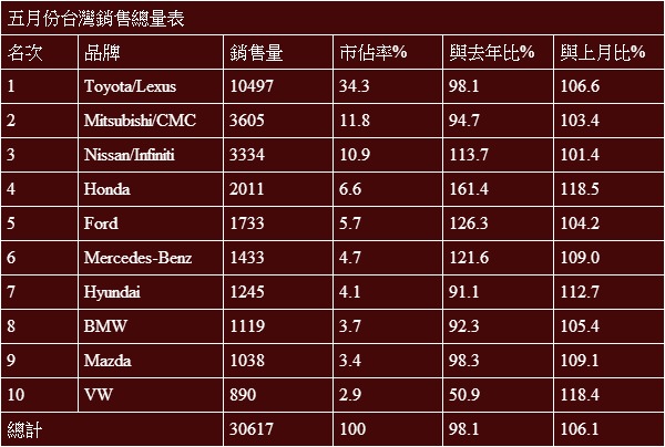 其中,五月份汽車品牌銷售冠軍理所當然仍是Toyota/Lexus系統,以破萬的10497輛穩居龍頭寶座,值得注意的是,隨著整體市場的總體銷售數字成長,Toyota/Lexus的佔有率仍獲得微幅進展,相對之下主要對手(雖說尚有段不小的差距) 的Mitsubishi/CMC則成了受害者,雖然靠著商用車系統穩定的銷售狀況仍讓他們維持亞軍位置,但市佔率卻略遭前方的Toyota/Lexus與其它競品壓縮,一路走來越顯掙扎。