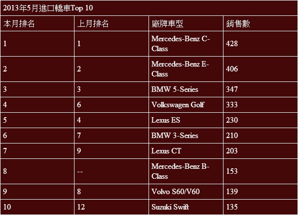 第十名則由Suzuki旗下最暢銷的Swift車系以135輛奪下,重返前十名行列。