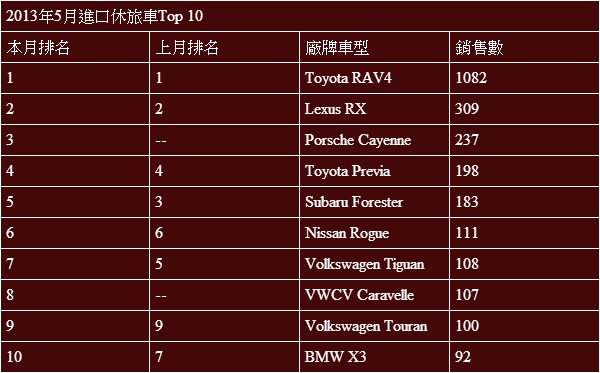進口休旅市場方面,前兩名依舊由Toyota RAV4與Lexus RX這集團兩進口休旅銷售王所盤據,雖然RAV4較上個月表現衰退,但仍是此排行榜中唯一一款有著四位數銷售數字的熱銷車型。此外,同品牌的Previa表現也持續穩定,與上個月相同一樣穩坐第四名寶座。