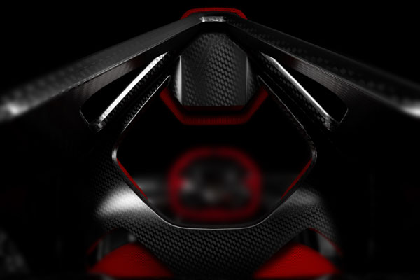 剩下的兩張照片中,第五張中央紅色的方向盤角度了解,應為從車身後方往前拍攝的角度,有著以碳纖維打造的特殊結構;第六張照片中,則應為後尾翼下方的部分,那三角型的設計相當特殊,但作用為何?目前則尚未得知。