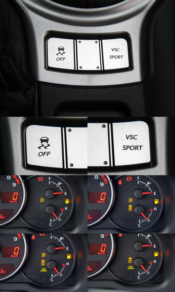 BRZ配置有VSC 車輛穩定控制系統 (附VSC SPORT模式),TRC 循跡防滑控制系統,可藉由中央鞍座上的兩顆按鈕交互切換、搭配出多種輔助模式,亦可長按左方的TRC 循跡防滑控制系統控制鈕,將所有系統關閉。