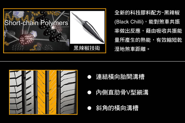 Conti全新的科技膠料配方-黑辣椒(Black Chilli),能對煞車共振率做出反應,藉由吸收共振能量所產生的熱能,有效縮短乾溼地煞車距離,而橫向溝槽設計,不只在剎車時不易打滑,更大大增加了濕地操控的安全性。