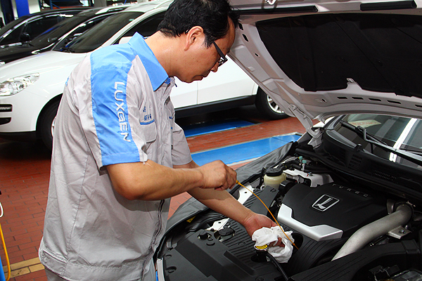 技師也會為引擎機油進行檢查。特別的是,Luxgen5 Sedan的引擎機油尺為塑膠製品,與一般常見的金屬油尺有滿大的不同。