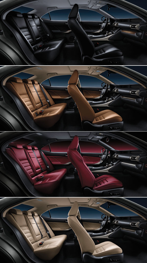 IS 250/ 300h 搭配17吋5幅雙肋鋁圈;而F SPORT車型的18吋燻黑鋁圈,設計理念承襲Lexus頂級超跑LFA的Y型樣式輪圈,讓車身更具動感跑格。依版本不同,全新IS提供8種外觀色可供顧客選擇,其中包括了IS車系首次採用的極光鈦,多了兩道漆面且運用全新Sonic烤漆工法,讓車身在陽光下透過不同角度產生不同的光澤變化。