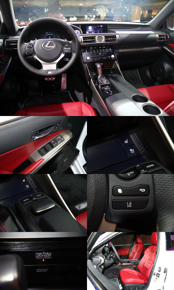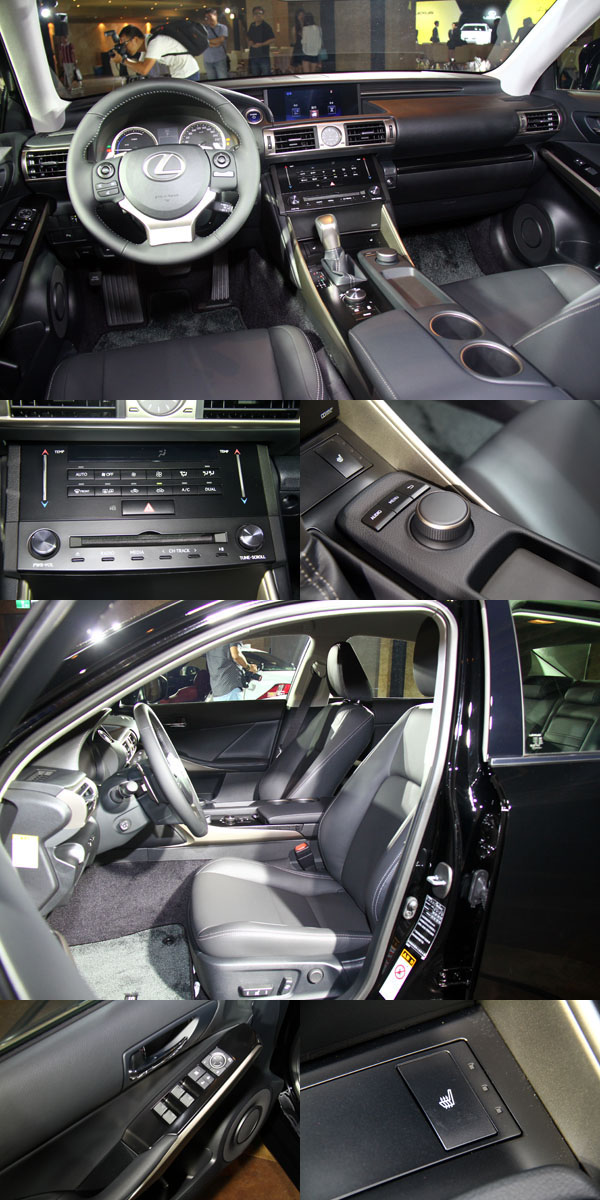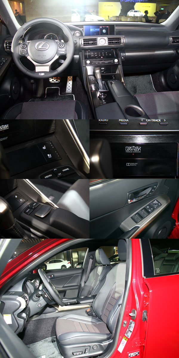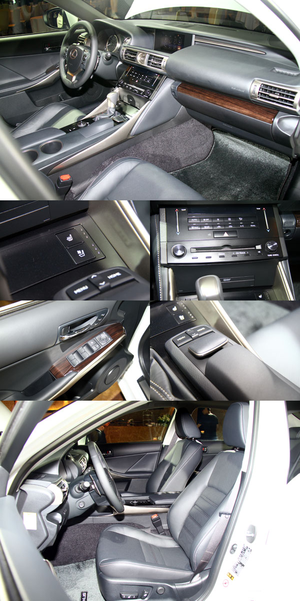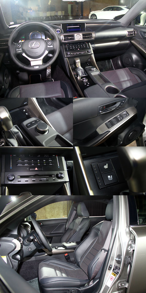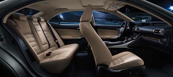 IS車系皆搭載運動化座椅側邊長度增加提供更佳的大腿支撐性,減緩旅程疲憊,同時各等級皆搭配駕駛座10向與乘客座8向的電動座椅。其中前座之前後滑動調整範圍增加,提供駕駛者更自由的坐姿選項。座椅位置及高度、方向盤角度皆依據在賽道上測試做了更符合戰鬥操駕的最佳設定。F SPORT版的前座更首次採用一體塑形座椅工法,將皮革固定於鑄模後,直接將坐墊內容物填充至皮革內。該創新工法創造了絕佳肩部與腿部包覆性,在提供更美觀的椅面造型且降低皺紋產生之外,更給予駕駛人完美的支撐以抵抗過彎G力。