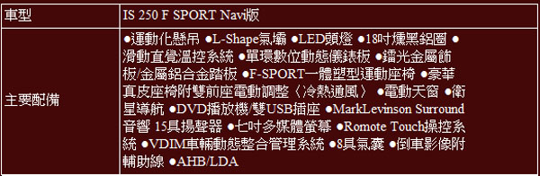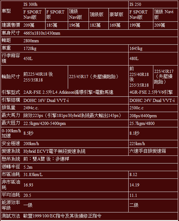 全新IS車系規格表: