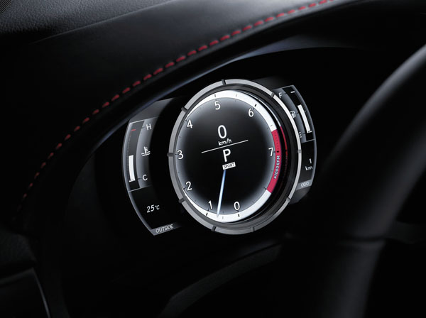 F SPORT版專屬的單環數位動態儀表板源自頂級超跑LFA的儀表板設計。8吋TFT LCD螢幕搭配動態的單環儀表設計,當駕駛需要查詢相關行車資訊時,單環儀表板將會向右滑移,讓駕駛者方便查詢資料。在ECO或NORMAL模式下,單環內側散發出淡淡的藍白色光暈。在SPORT模式下,單環將會轉換成白色光圈。隨著轉速提升,光圈內側又會散發出紅色光暈,激發駕駛操控熱情。