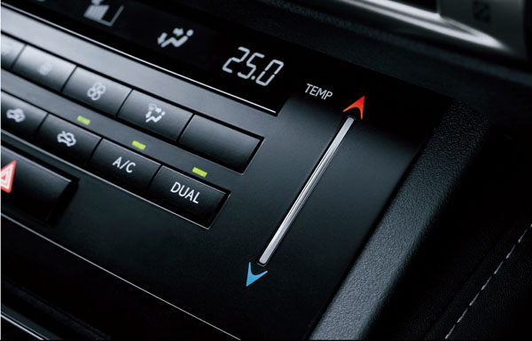 世界首創的滑動式直覺溫控系統源自於LF-CC概念車,駕駛者只需直覺地上下滑動溫控感應軌道,即可快速調整溫度。此外亦可按壓軌道上下段或箭頭處以0.5度做微幅調整。相較於過去的溫控系統,加入活性碳除臭功能,提升乘坐的舒適度。新的過濾裝置更可以將車外其他車輛廢氣攔截。