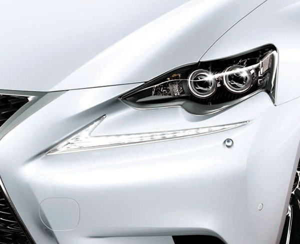 全新IS擁有前衛動感的外觀設計,導入Lexus Spindle Grille家族車系風貌之紡錘型水箱護罩,並與全新家族識別LED箭型日間行車燈相互呼應,讓車頭更顯霸氣。由車頭一路向後延伸與從車側一路上揚的兩條褶線交會於車尾,大膽的肌肉線條讓全車更具動感。尾燈組採用大量的LED燈具,讓全新IS行駛於夜間時,不但耀眼迷人且具節能功效。