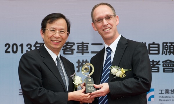 台灣賓士轎車業務行銷副總裁司達恆(左)與環保署長沈世宏(右)。