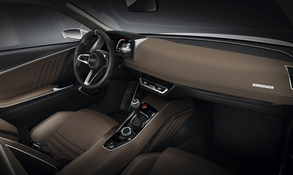 相較於目前Audi旗下車款於座艙中科技風與豪華並進的鋪陳手法,quattro concept則是盡可能地簡化所有界面,以最簡單的配置還給乘客最純粹地駕駛與乘坐體驗。基本上,quattro concept在座艙中還是真皮做為最主要的包覆材質,並且選用暖調的深米色為基調,在與黑色相搭配,同時輔以碳纖維與金屬材製做為點綴,營造出全然不同地高質感。