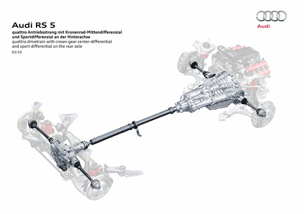 quattro concept延續了RS5的配置,採用冠狀齒輪中央差速器,在一般行車狀態下,採前40:後60之動力輸出比例,當其中一組傳動軸失去抓地力時,便會將較多的動力傳向循跡性較佳的傳動軸,當前輪失去抓地力時,最多可將85%的動力分配至後軸,當後輪失去抓地力時則最多可將70%的動力分配至前軸;較大動力分配範圍,以及更迅速地動力分被速度,可提供車輛最佳的循跡性,此外,整體差速器的重量為4.8kg,遠比前一代系統來得輕約2kg。