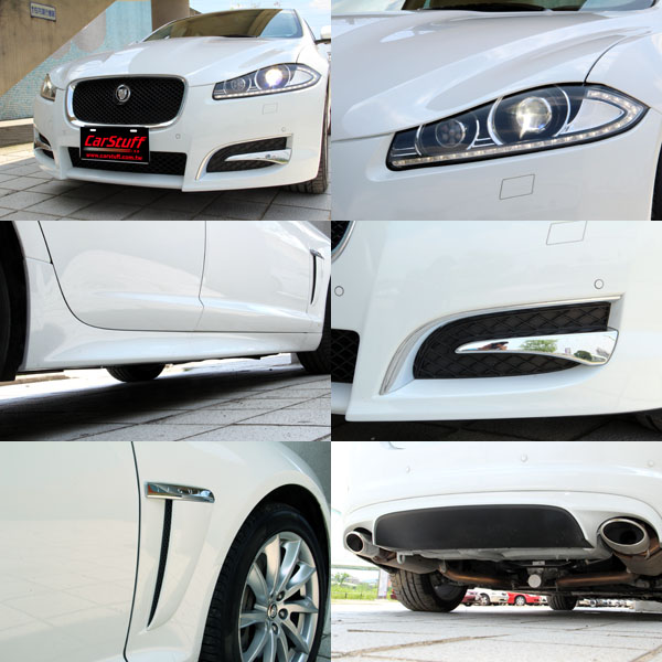 在時間演進下,XF車系在2011年進行小改款工程,於外觀做重新修飾,於銳利的頭燈組內加入J-Blade LED日行燈,車側再搭配車身同色散熱鰓與工法講究的一體成形鍍鉻窗框,車尾則是於改變中央鍍鉻飾條與排氣尾管樣式,並且在後保感下方改採黑色塑料包覆,尾燈也同樣以LED燈組排列出與頭燈相互呼應的造型,使得整體造型更為動感有活力,而在本次試駕的XF 3.0 V6 S/C Premium Luxury車型上更配備了原廠Aero Dynamic空力套件組,包含Aero Dynamic前保桿含黑烤漆水箱護罩、Aero Dynamic專屬側裙組、整合下擴散器的Aero Dynamic後保桿含黑烤漆下擾流以及Aero Dynamic後尾翼,進一步強化運動氣息。