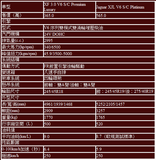 為了持續提供更貼近消費者需求的產品,Jaguar陸續為這兩個車系導入了全新的動力系統,而Jaguar台灣總代理九和汽車,也在導入這兩個車系之2013年式車型的同時,重新整併這兩個車系的產品線,同步加入了2.0升渦輪增壓汽油引擎與3.0升機械增壓引擎車款,其中本次試駕的XF 3.0 V6 S/C Premium Luxury與XJL V6 S/C Platinum分別成為了這兩個車系在台灣的旗艦車款,於XF車系中取消引進3.0 D柴油車型,以及在XJ車系中暫不再導入5.0升V8大排氣量動力車型。
