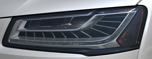 即將運用在小改款A8的矩陣式LED頭燈,將會整合25具高強度的LED發光單體,並以5個單體為一組的模式,搭配一組反光鏡,運用電子控制機構控制投射的角度與照明亮度。當頭燈設定處於Automatic自動模式,並切換至遠光燈狀態下,若是車輛行駛於高速公路,系統會在30km/h以上的速度自動啟動。而在市區行駛之下,則是必須在車速高於60km/h才會自動啟動,再給予充足罩名的同時,也能避免強光對於周邊人車的影響。