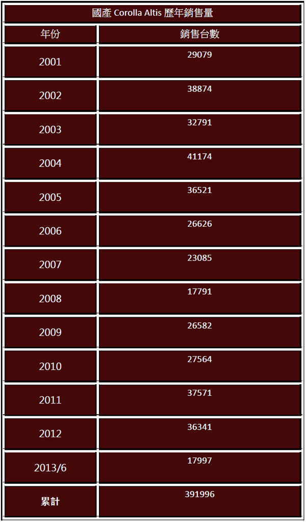 在乘用車部分,若要說到最強的銷售之王,非Toyota Corolla Altis莫屬,自2001年導入台灣生產至2013年六月為止,在台灣共銷售出391996輛〈和泰汽車提供之數據〉,連續12年榮登台灣不分級距乘用車銷售冠軍,相當於平均每年可以在台灣賣出超過30000輛,扣除今年度至六月的銷售量,2001年三月至2012年12月累計銷量為373999輛,這12年間每年的年度新車銷售總數,曾在2005年攀上50萬輛的高峰,也在2008年跌落至近23萬輛,以每年平均約35萬輛左右計算,相當於這12年來台灣每販售出的10輛新車中,就會有一輛Toyota Corolla Altis,占有率高的驚人,而且Toyota Corolla Altis不只是在台灣賣得好,更是目前全球新車累計銷量最多的單一車系,Toyota Corolla自1966年問世以來,至今已累計銷售超過4000萬輛,無車能出其左右,強大地銷售魔力,被台灣網友喻為〝神車之首〞。