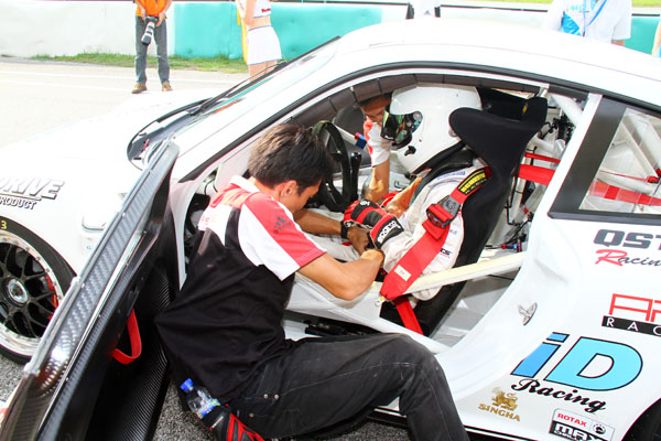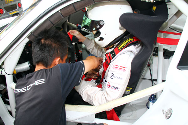 在正式起跑前負責後勤維修的EKS團隊技師,會確認駕駛安全裝備是否穿戴完整。