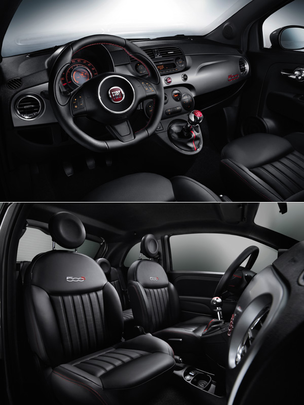 Fiat 500S的車室以黑色為色彩基調,並以部份紅色的細節點綴來強化其動感。