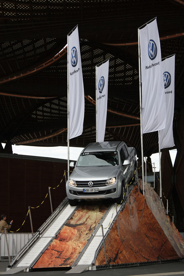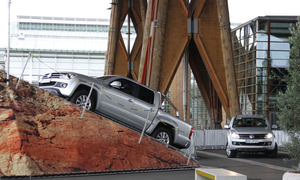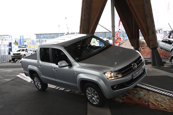 兩年一度的全球商用車大展甫於9月底圓滿落幕,整個展區最引人注意的就是福斯商旅車,不但高調同時發表四款新車:Multivan 25週年紀念款、T5 4Motion Rockton、Caddy GP及Amarok Single Cab, 還開闢戶外體驗專區讓玩家們一嚐Amarok的強悍性能,包含它令人稱奇的Off-road ABS科技。體驗專區中先讓車輛爬上模擬的連續石塊路況,在懸空一輪的狀態下參觀者發出第一聲驚呼,Amarok輕鬆展現跨越23°連續陡坡的能力,接著通過側面斜坡車身已呈現超過30°的側傾,旁觀民眾再度發出驚呼聲但駕駛與乘客此刻卻依然談笑自若,因為縱使近50°的側坡對Amarok來說也是易如反掌,過來參觀民眾看著Amarok衝上一個像蹺蹺板的裝置,天呀!所有人倒抽一口氣,就在同時Amarok就從蹺蹺板的另一邊順利駛下,最後所有人的目光轉向場中一個山丘想說這應該是作為場景,沒想到Amarok瞬間就站上了陡坡的頂端展現它足以攀爬近45°陡坡的神奇能耐,現場又是一陣驚呼,最後以勝利的姿態Amarok完成了一輪的示範。看到這裡,玩車的行家們應該都已經心照不宣,因為只是小試身手就顯露Amarok不凡的能耐。放眼當下還有什麼車款可以比擁有一台這樣的性能猛獸更讓玩家們血脈噴張。