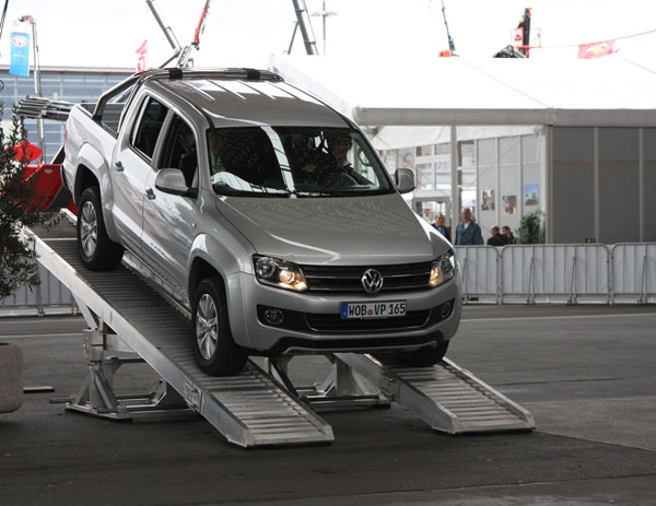 會場中展示的Amarok包含歐規入門的基本Comfortline車型,配備外觀防刮傷套件、四顆氣囊、高度可調整前座椅與可收折後座;而Trendline等級則是增加了同車色防護外觀套件、 16吋鋁圈、電動門鎖與電動窗;至於最高等級的Highline等級則是再增加外觀鍍鉻飾條、17吋鋁圈、對比內裝配色與恆溫空調等;而Amarok車尾的貨斗總乘載面積為2.52平方公尺,能夠提供最大承載重量為1.15噸,再搭配的拖車勾套件,就能夠支援2.8噸重的拖曳能力。外觀上有著強烈的肌肉線條搭上福斯最新水箱罩與頭燈設計,不只強眼還散發出濃烈的運動氣息。車室內的配置,完全與VW高級房車等級,無論是組裝用料或是人體化操作介面等等,都兼顧到實用性與整體運動風格。