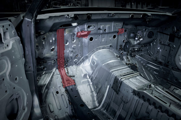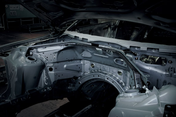 隨著動力輸出的提升,原廠也同步提升了新款GT-R地車體剛性,其中在引擎室中配至碳纖維複合材質製成之結構連桿,連接與左右壁震塔與擋火牆間,同時與副駕駛側與儀錶板後之擋火牆中強化結構,可有效地吸收地面所傳來地衝擊,減緩車體變型的可能,以提供車輛更佳地操控反應,以應付高速過彎時地高G值。