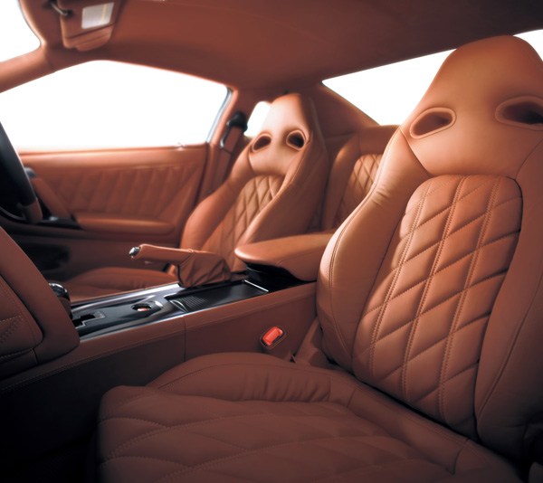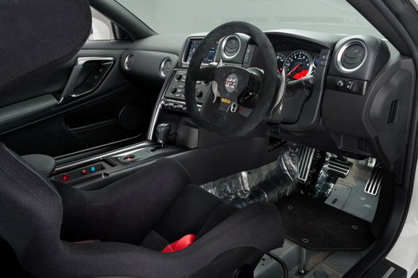 座艙部分則維持現有陳設,但加入了碳纖維中控台飾板,空調出風口之金屬飾環也增加燻黑處理,而方向盤中央地GT-R也經過全新亮面鍍膜,以增進整體質感。前座兩張跑車座椅也經過重新修飾,以提供更好的側向支撐性,並且延長與修飾椅墊,可有效減少大腿與腰部的疲勞程度。