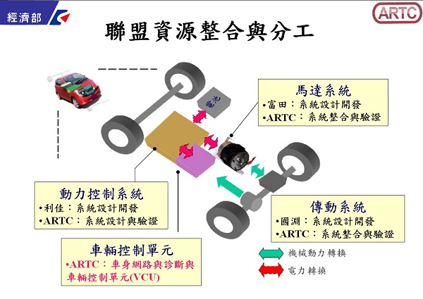 經濟部技術處為了促進產業創新,鼓勵廠商投入參與研發,積極推動產業聯盟以創新技術、產品整合策略進入國際市場,而電動車先進動力系統研發聯盟即是因此應運而生。聯盟特色主要由富田負責馬達技術開發,利佳專司動力驅動控制系統,國淵致力EV專用傳動系統開發,而車輛中心提供系統控制及智慧化技術整合know how與推動輔導(請見分工圖)。接著兩年內,將投入5億新台幣以上開發經費,一經完成將可適用於任何車型底盤,是台灣掌握核心技術的最佳契機,預期在三年內創造高達30億元產值。