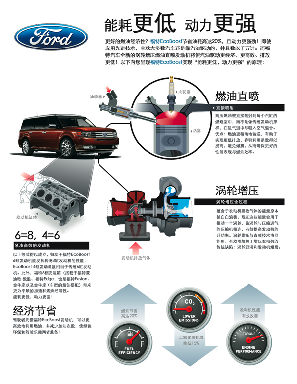 Ford EcoBoost GTDi新動力技術廣受消費者青睞,因為它能在實現卓越燃油經濟性的前提下,同時輸出強勁的動力並展現優越的性能,在美國更已獲得125項專利及專利應用。它將渦輪增壓和燃油直噴技術結合,能輸出領先同級車的動力和扭矩,使得2.0升直列四缸引擎的動力相當於3.0升V6引擎。同時還能提高燃油經濟性高達20%,並降低15%的二氧化碳排放。