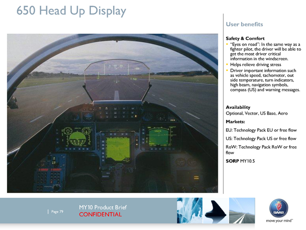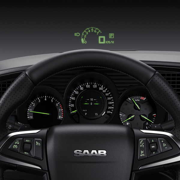 由類似戰鬥機技術靈感所激發的抬頭顯示器(Pilot HUD)就是時下熱門的配備,而新9-5的等級格局更高。以虛擬影像顯現在駕駛者眼前2公尺處,經由HUD投射出速度、方向燈、導航、警告等訊息,自然融入駕駛環境中。由於不像其他品牌車款在玻璃上顯示,新一代9-5駕駛者不需將視線移開前方道路,更能確保行車安全,既科技又實用。