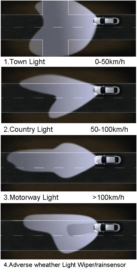 精密的光學技術,在新9-5車上看到了科技與人性的貼切互用。雙氙氣智慧光束是目前高級豪華車上最精密的新創,使用可轉動的雙氙氣頭燈,提供車前方更佳的照明,並自動將光束進行最佳化的調整。當車速低於50公里時,市區燈可以提供寬廣平坦的光束,更易看到行人與路邊動態。當100公里時速時,郊區燈的長光束,維持鮮明的路邊照明。而在超過100公里的高速公路上,則會啟動高速公路燈,進一步將光束增加到140公尺,讓視野更清晰。