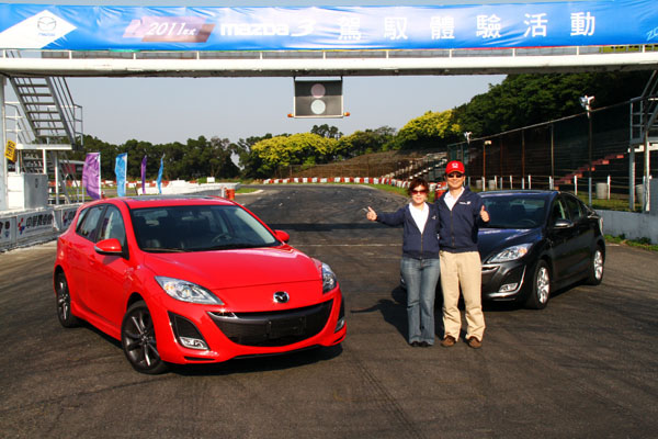 透過2011年式Mazda3車型的全新發表,Mazda Taiwan終於選擇在台灣知名龍潭樂活賽道舉辦試駕體驗活動,活動中兩位重要推手:左為Mazda Taiwan營運總監朱玫君與台灣賽車界與車輛改裝領域相當知名之盧政義先生。