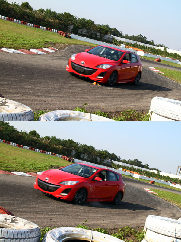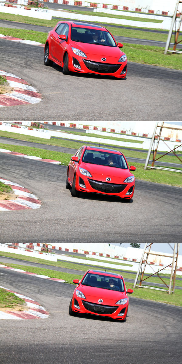 耶穌彎中雖然車身側傾難免,但硬朗的車身剛性、底盤強度與懸吊支撐力,讓Mazda3 2.5S 5D可以相當穩定的姿態通過此彎道,並為出彎前全油門作穩當準備。