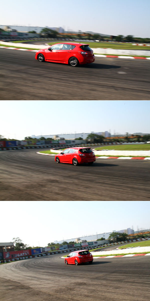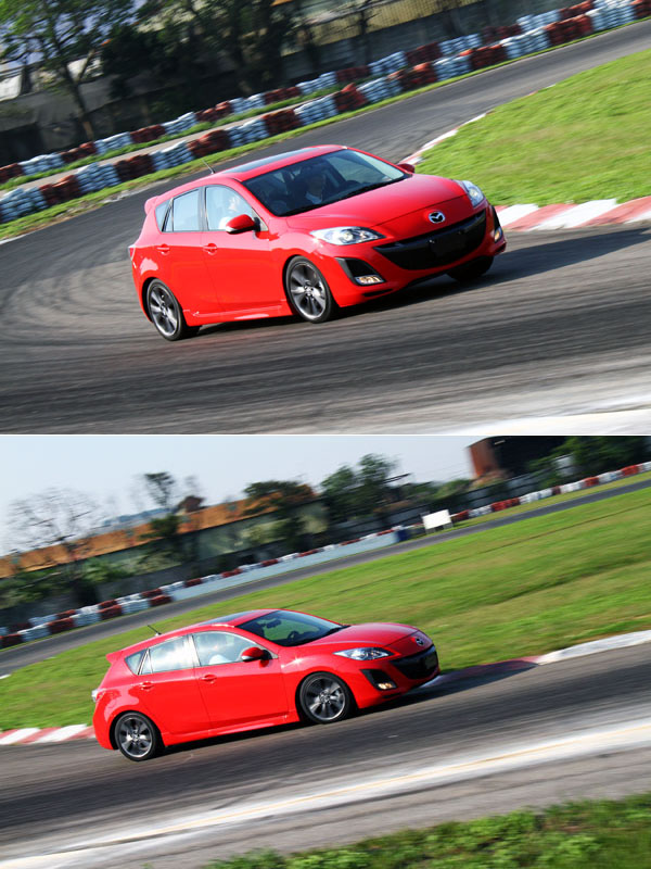 迅速的兩圈體驗,Mazda3 2.5S五門掀背車型運動身手毫不保留的全數傾瀉,綜合盧政義與試車組自身感受,Mazda3 2.5S五門掀背車型在全原廠的設定中,在此賽道上提供了令人驚艷的穩定性,由其中高速的懸吊支撐性,更是出乎意外的出色;不僅如此,刁鑽彎道中的轉向不足情事相當輕微,後軸的跟進速度更是俐落的不拖泥帶水,加上犀利的制動力道提供快速的重心轉移,配合上作動反應快速且支撐性足夠的懸吊,當然高剛性車身與底盤強度,更是讓以原廠姿態上場的Mazda3 2.5S五門掀背車型有著夠水準的操控表現。對此,不僅盧政義讚譽有佳,於此賽道體驗多次的試車小組,也對Mazda3 2.5S五門掀背車型之表現留下了深刻印象。