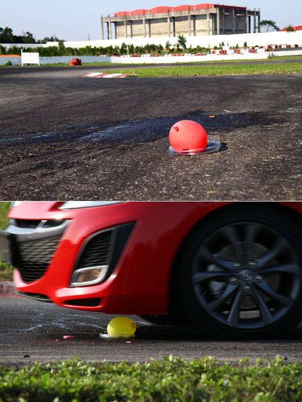 趣味性十足的碾壓水球競賽,在遊樂中展現出Mazda3車系準確的轉向反應與不俗的動態表現。