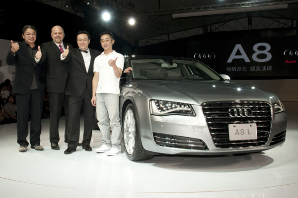 視覺藝術家周育正(右起)、台灣奧迪汽車邱山祥總裁、德國經濟辦事處魏諾朗處長、台灣數位藝術大師林俊廷共同與全新進化Audi A8合影。