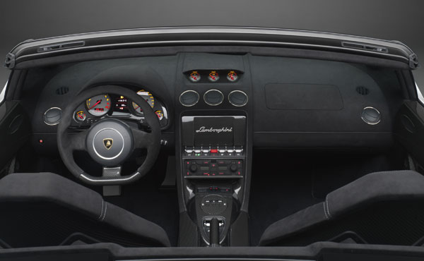 Gallardo LP 570-4 Spyder Performante外觀上之空力套件、後視鏡、平整化底盤等皆導入CFRP材質打造,而19吋輪圈也為減重重點之一。