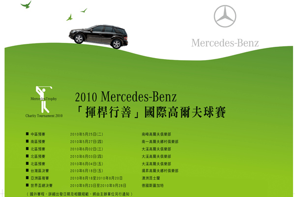 「M-Benz揮桿行善國際高爾夫球賽」自即日起開始受理報名,額滿為止,敬請把握機會!欲參賽之賓士車主請親至全省台灣賓士授權展示中心報名,或電洽台灣賓士客戶服務專線:08000-365-24瞭解活動及報名詳情。