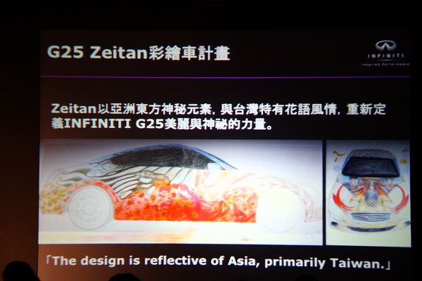 裕隆日產特別邀請加拿大超現實主義畫家Heidi Taillefer,來台繪製Infiniti G25「Zeitan」的彩繪車,「Zeitan」的彩繪車以亞洲華人的象徵-鳳凰為主要的構圖,東方與西方的元素在圖面中激盪,充滿新奇的視覺饗宴。裕隆日產此次以「藝術彩繪」,作為全新車款G25的發表,受到台灣設計、藝術媒體,及創作者的矚目。