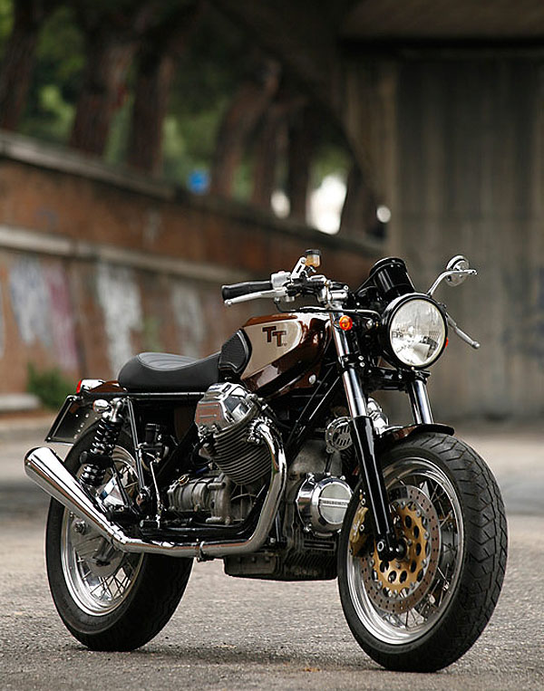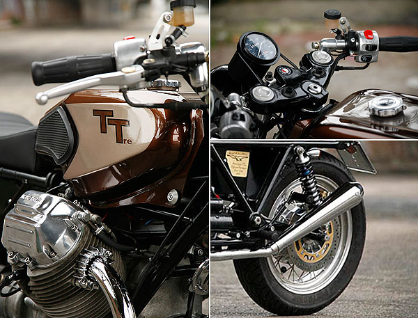 這款全新的TTre是由Rossopuro旗下的設計師Philip Barbican操刀訂製而成,為了將現代風格不衝突的置入Moto Guzzi的設計哲學中,Philip Barbican還是將1000SP的輪廓保留,不過整體的造型卻是完全的出走,讓人想起MOTO GUZZI先前在2009年EICMA米蘭國際車展中所展出的V7 Clubman Racer概念車,除了油箱、可調式Tommaselli 45mm把手、拋光V型雙缸90度夾角引擎、兩側球棒狀的排氣管、鋼絲圈與加大通風碟為矚目的元素之外,排氣量949c.c.的氣冷引擎則是能夠輸出67hp∕6700rpm最大馬力,搭配五速國際檔配置,TTre就是Philip Barbican街車翻修最具體的詮釋。