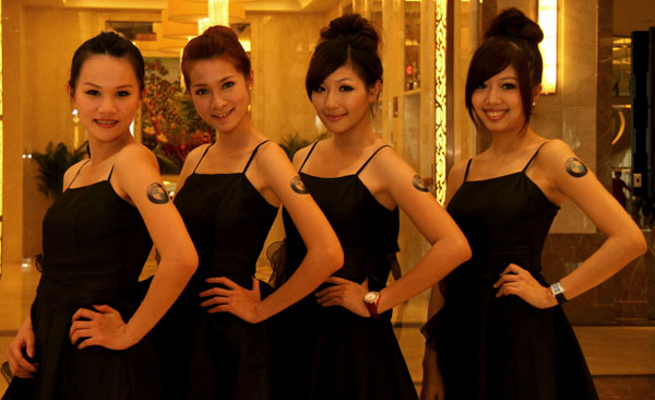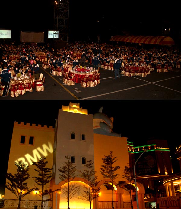 在義大世界的停車場席開百桌,並且在遊樂園的建築物上也打上了BMW字樣。