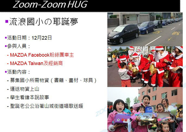 第一次的〝Zoom-Zoom Hug〞活動將於2010年12月22日開跑,Mazda將發動網路車主社群與經銷商一起參與,募集需要的物資,前往有流浪國小之稱的草嶺國小,扮演聖誕老人在山城街上傳頌溫情,與學生一起分享繪本,提前帶給小朋友們一個難忘的聖誕節!
